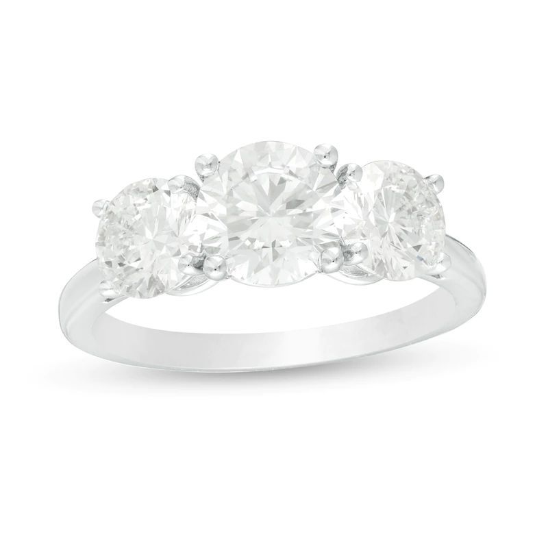 As timeless as your love, this beautiful engagement ring is ready to surprise and delight. Fashioned in 14K white gold, this blissful look features a majestic 1-1/2 ct. certified diamond flanked by a pair of shimmering 3/4 ct. certified diamonds, each boasting a color rank of G and clarity of SI2. Engraved inside the band and set with two accent diamonds, the words “Past, Present, Future” remind her of your promise to be by her side, always. Breathtaking with 3 cts. t.w. of diamonds and a brilliant buffed luster, this three-stone engagement ring makes the moment magical. This style arrives with a certificate that includes a photo and description of the diamonds, which guarantees quality and can be used for insurance purposes.This item is electroplated with rhodium or finished with an e-coating. These finishes may wear off with frequent use. Ask a jewelry consultant for details.